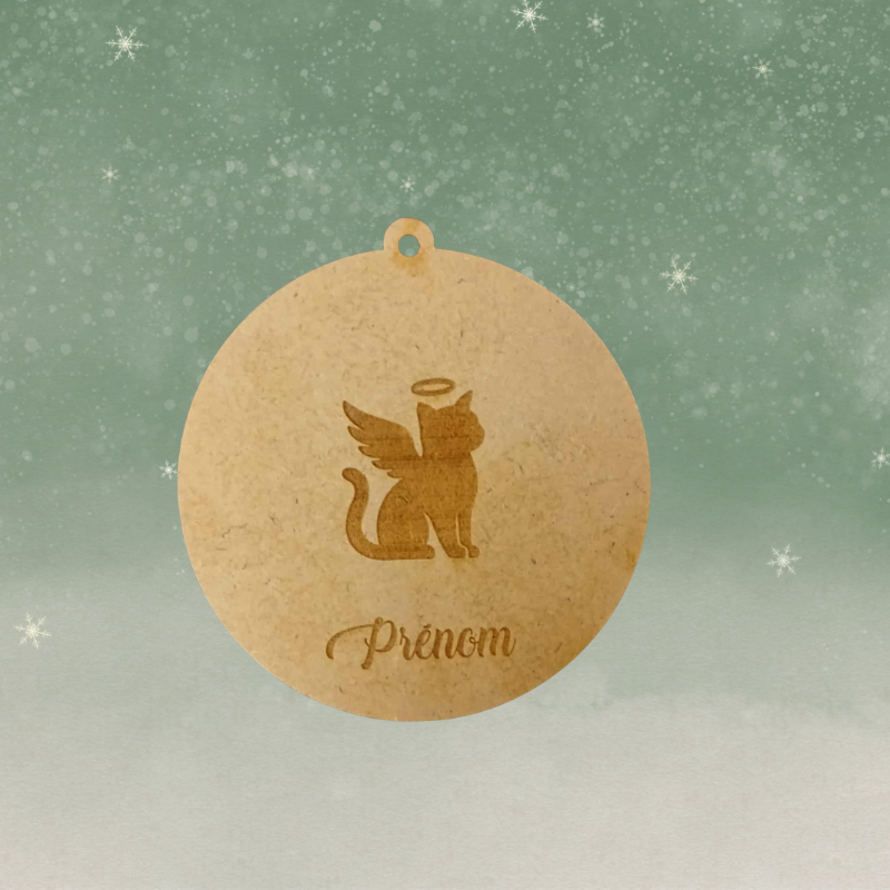 Cette boule de Noël en bois MDF gravée représente un chat ange, symbole de tendresse et de souvenir.